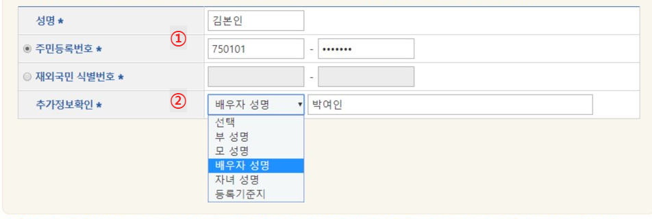 ① 신청인의 성명과 주민등록번호 및 본인 확인을 위한 추가 정보 입력