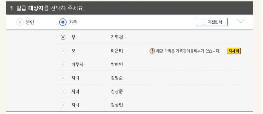 -발급대상자 선택란에 본인을 중심으로 발급을 받을 지, 가족 아버지를 중심으로 발급을 받을지 선택