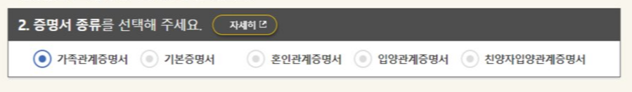 -발급받길 원하는 증명서의 종류를 선택. (가족관계증명서 선택)