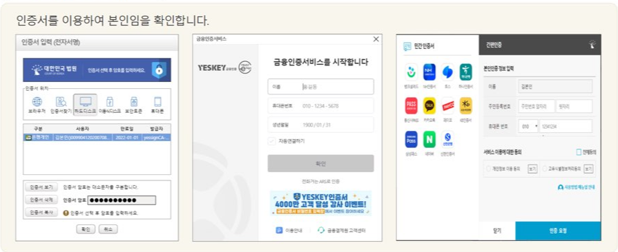 인증서를 이용해 본인임을 확인해야 함. 공동인증서, 금융인증서, 간편 인증 중에서 선택해서 인증